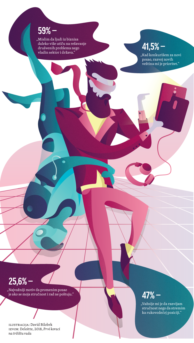 Čak 59% mladih smatra da vodeći biznisi trenutno pokazuju mnogo snažnije liderstvo nego vladin sektor u odnosu na mnoge važne društvene probleme (Deloitte, 2018, Prvi koraci na tržištu rada).